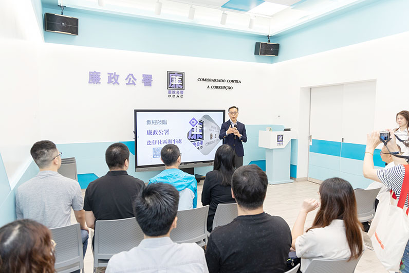 隨後,廉署社區關係廳廳長區肖卿、社區推廣及公關處處長辛孟曦和辦事處主任曾皓茵則以分享形式,詳細介紹了廉署的職能與性質,以及包括新媒體在內的各方面宣傳教育工作。公總青委一行還參觀了多媒體展示室,了解廉署的發展歷程,並體驗多項互動設施,包括3D武器展示櫃和觸控式證物展示櫃等。
