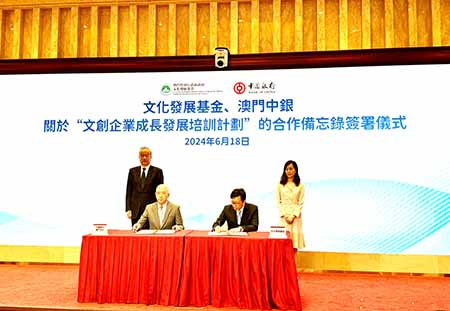 「文創企業成長發展培訓計劃」合作備忘錄簽署儀式於昨午在中國銀行大廈三十三樓多功能宴會廳舉行,在社會文化司司長歐陽瑜及中國銀行(澳門)股份有限公司董事長李瑞強見證下,由文化發展基金行政委員會主席張建洪與中國銀行澳門分行資深業務總監陳榮達共同簽署合作備忘錄。