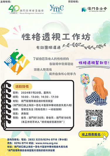 【特訊】由澳門管理專業協會屬下年青行政人員俱樂部主辦、澳門基金會資助的“性格透視 工作坊”將於七月二十日(星期六)假中華總商會大廈八樓管協演講室舉行。
