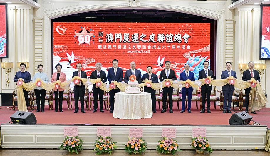 【特訊】澳門晨運之友聯誼總會昨日假萬豪軒舉行“慶祝澳門晨運之友聯誼會成立六十周年酒會”。全國政協副主席何厚鏵,中央人民政府駐澳門特別行政區聯絡辦公室宣文部部長萬速成,澳門晨運之友聯誼總會創會主席許世元,澳門特別行政區政府體育局局長潘永權,澳門特別行政區政府衛生局局長羅奕龍,澳門中華總商會永遠會長馬有禮,鏡湖慈善會副主席黄國勝,澳門日報讀者公益基金會會長賀定一,澳門潮屬社團總會主席劉藝良,澳門同善堂值理會副主席鄭秀明,澳門晨運之友聯誼總會主席李俊鳴,澳門晨運之友聯誼會會長徐家頴,.澳門晨運之友羽毛球會會長陳隆成等主禮嘉賓,以及政府有關部門、各界社會賢達和澳門晨運之友“四會”會務負責人等近五百名嘉賓出席。