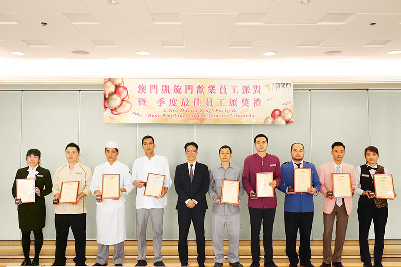 澳門凱旋門「季度最佳員工」獎項是根據員工在「工作質素」、「溝通技巧」等能力,以及「團隊精神」、「責任感」和「服務態度」等多項標準進行評選。本季度的獲獎者分別是餐飲部 - 陳智藝及鍾有紹、管家部 - 鄧智文、工程部 - 曾憲秤、物業部 - 凌雁群、娛樂場運作部 - 陳雲娟及李俊賢、娛樂場保安部 - 劉偉發、籌碼兌換處 - 李惠霞。澳門凱旋門人力資源及企業傳訊高級經理張啓仁先生向得獎者頒發嘉許獎狀及襟針、餐飲禮券以示鼓勵,他對員工的付出和努力表示感謝,並期望得獎員工繼續保持奮鬥精神,與公司共同成長。