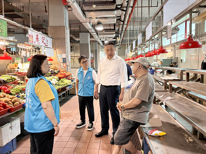 【特訊】近日,立法議員顏奕恆與板營坊會會長鄒金玉,以及街總南區辦事處主任曾家樺一行,到營地街市、公局新市東街一帶巡區,旨在深入了解街市經營者的營運狀況,並就街市的布局及商戶上落貨區地面損壞等問題收集居民意見。他們表示,營地街市的熟食中心長期以來備受市民青睞,亦是許多旅客來澳必訪的熱門地點。然而,有經營者提出,營地街市的設施到目前已略顯陳舊,衛生環境更有待改善。