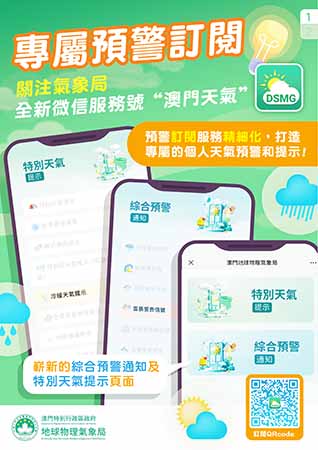 氣象局將持續檢視和優化各項訂閱功能及推送服務,並繼續致力為用戶提供更適切和貼心的氣象服務體驗。歡迎公眾自即日起於微信平台搜索「澳門天氣」官方賬號或掃描二維碼關注全新微信官方賬號,有關賬號將與原微信官方賬號「澳門地球物理氣象局」並行一段時間,而原有賬號的停止運作日期將再適時公佈。