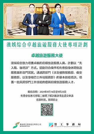 【特訊】為支持本地人才全面發展,拓展多元職涯路向,勞工事務局與澳娛綜合度假股份有限公司合作推出“澳娛綜合卓越旅遊服務大使專項計劃",以“先入職、後培訓”方式,為有志投身綜合旅遊休閒服務行業的澳門居民提供全方位培訓及事業發展機會,計劃由9月16日起接受申請。