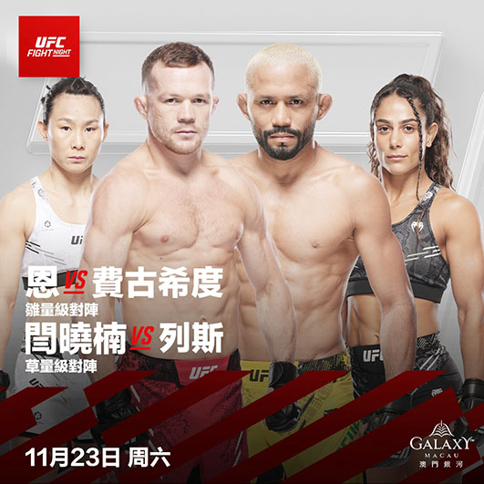 【特訊】「澳門銀河™」世界級奢華綜合度假城(下稱「澳門銀 河」)早前與世界頂尖綜合格鬥 (MMA) 組織 UFC 簽訂賽事合作協議,宣布將於本年 11 月 23 日在澳門最大的室内綜藝館銀河綜藝館舉辦 UFC 格鬥之夜澳門站:恩 vs. 費古希度,這一全 球頂級綜合格鬥比賽時隔十年之後重返澳門。今日,「澳門銀河」聯同 UFC 正式公布賽事及 門票詳情。賽事當日,下午 4 時副賽準時開戰,主賽則於晚上 7 時打響。