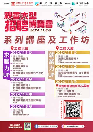 在本次大型招聘博覽會前夕,將聯同一眾企業的人力資源代表及資深人力培訓師,於11月1日至8日期間舉辦多場系列性講座。圍繞求職力、就業力及發展空間為主旨,提供內容涵蓋:履歷撰寫、面試技巧、提升職場技能、素養意識等實用技巧,生涯規劃工作坊,以及由企業代表分享行業發展空間、職業故事、最新的就業市場趨勢和招聘崗位能力需求;從而,提升求職者的就業競爭實力、加強了解行業和崗位的發展前景、並助力自我探索發掘適合的職業發展之路,為職工提供全面的就業支援,制定有效職業規劃發展。