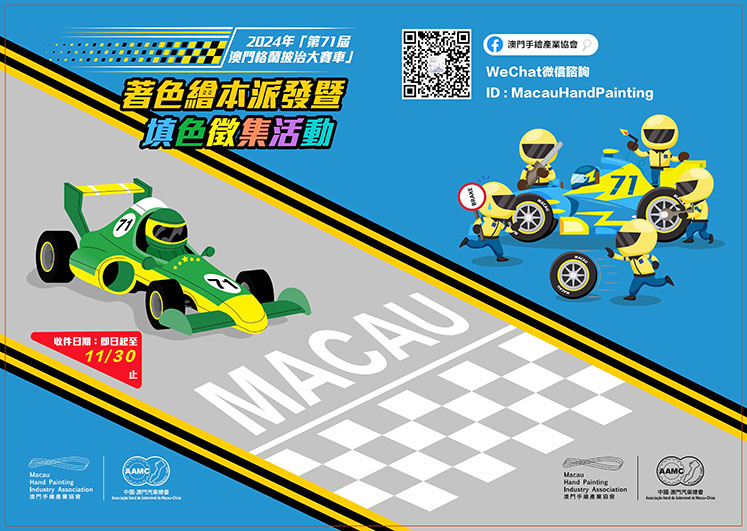 【特訊】為推動本澳手繪產業發展,由澳門手繪產業協會、中國-澳門汽車總會主辦,澳門文化發展基金贊助的2024年「第71屆澳門格蘭披治大賽車」著色繪本派發暨填色徵集活動即日起開始接受報名。