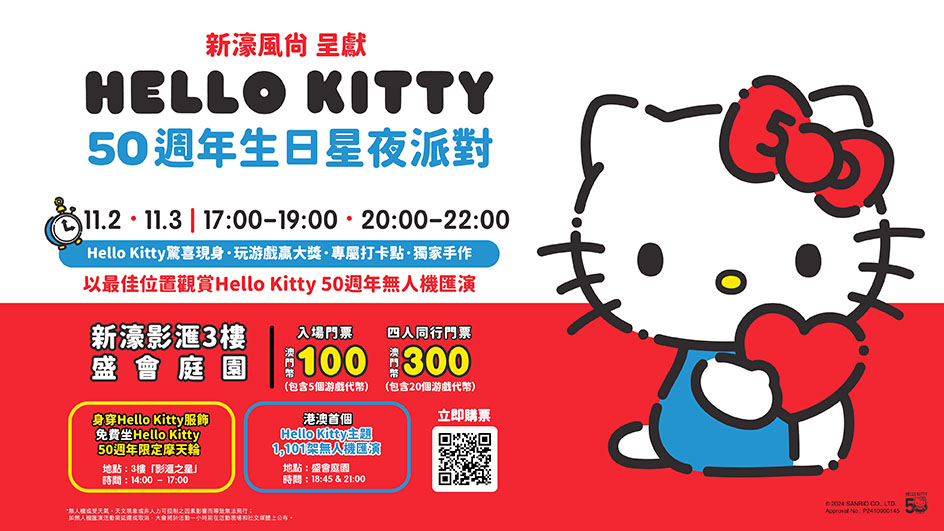 【特訊】 新濠風尚呈獻:Hello Kitty 50週年生日星夜派對,將於11月2日及3日限定2天為深受全球喜愛的人氣角色Hello Kitty慶祝生日!新濠貫徹休閒娛樂領先地位,舉辦一場前所未有的盛大慶典 —「Hello Kitty 50週年生日星夜派對」將呈現一場令人驚嘆的視覺盛宴!