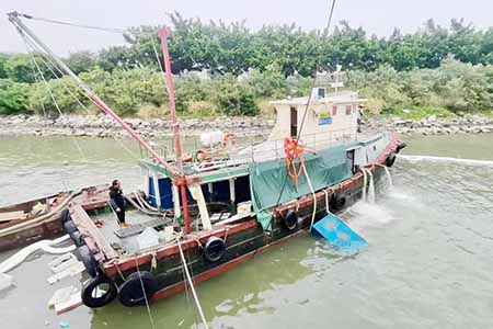 【特訊】海事及水務局昨早(四日)在旅遊塔對開海面,協助吊運船對昨晨碰撞護橋欄後傾側的漁船進行吊運打撈,利用抽水泵等設備,把傾側船隻扶正及吊起,並於昨日下午4時完成打撈工作,漁船被送往內地維修,打撈作業期間不影響海上通航。