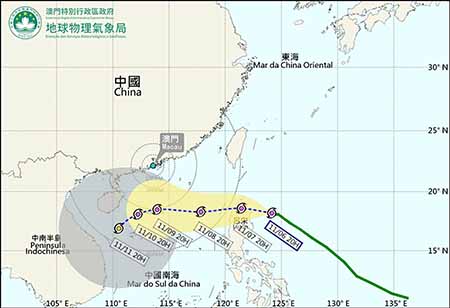 【特訊】澳門氣象局表示,位於菲律賓呂宋附近的熱帶氣旋「銀杏」,未來兩日將以偏西方向移動,按照現時預測路徑,預料週五(十一月八日)進入本澳八百公里範圍,並於週末繼續西行橫過南海中北部,但受東北季風影響,預料「銀杏」進入南海後強度將逐步減弱。由於「銀杏」進入南海後強度及路徑仍存在不確定性,氣象局會視乎情況發出熱帶氣旋信號。