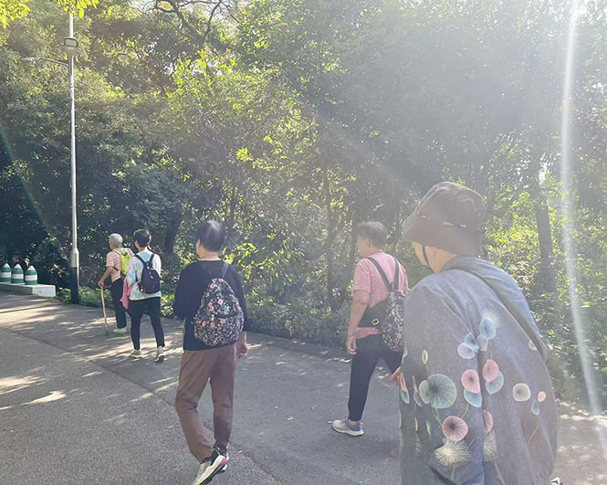 此次活動組織長者一同步行松山。十月的秋季天氣宜人,無論是避開夏日的炎熱還是冬季的嚴寒,都是接觸大自然的最佳時機。參加者從松山行人隧道出發,首先參觀隧道兩側展示的澳門傳統建築和特色建築的顯示屏。隨後,他們乘坐電梯前往松山健康徑,最後步行至得勝斜路的出口。在健康徑兩側,翠綠的植物讓參加者在步行途中能呼吸到新鮮空氣,欣賞澳門的美麗風景。