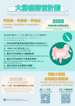 衛生局呼籲符合下列所有條件者,儘早參加2025年度免費的“大腸癌篩查計劃”,具體如下:1.持有效澳門居民身份證(包括永久和非永久);及2.於1956年至1970年出生,即年齡界乎55至69歲;及3.最近5年內沒有進行大腸鏡檢查;及4.最近2年內沒有進行大便潛血檢測;及5.沒有大腸癌病史。