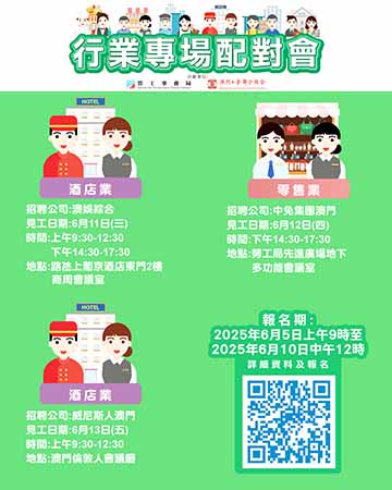 【特訊】為協助有求職需求的澳門居民盡快就業,以及為緩解業界的人資需求壓力,勞工事務局(下稱“勞工局”)與澳門工會聯合總會(下稱“工聯”)合作於6月中旬舉辦3場行業專場配對會,合共提供114個空缺。