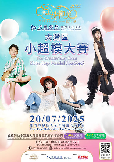 《交通銀行澳門分行呈獻:大灣區小超模大賽》金沙中國積極為嘉年華添加嶄新元素,今年首辦的「大灣區小超模大賽」開放來自本澳及大灣區城市5至16歲兒童及青少年參與,給予小小模特兒挑戰自我、展示青春活力的機會;報名費用全免。比賽將於7月20日(星期日)舉行,即日起至6月27日開放報名。如欲報名參與或了解更多關於比賽時間、獎品及報名要求等詳情,請瀏覽:https://1ticks.com/event/Kids-Top-Model-Contest-2025。