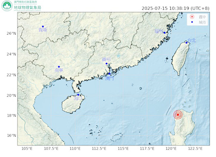 氣象局表示,在本澳時間昨日早上十時三十八分錄得菲律賓呂宋發生一次五點五級地震,震央距離澳門東南偏東約八百七十一公里,截至昨日早上十一時三十分,當局收到一名市民報告感覺到是次地震, 本澳對上一次錄得之有感地震為今年六月二十三發生於廣東省清遠市,距離澳門西北偏北約一百六十六公里發生之四點三級地震。