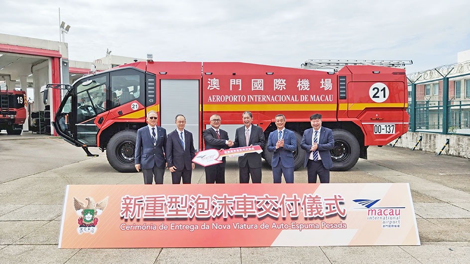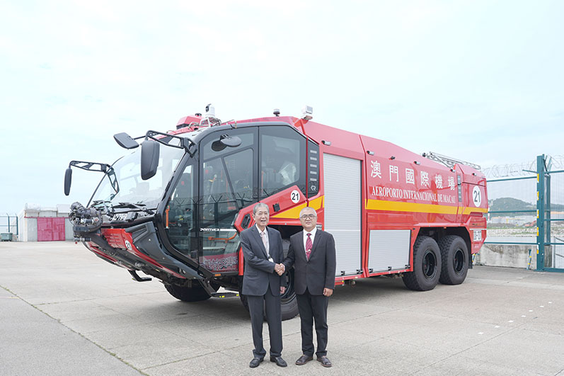 在儀式上,馬主席對澳門消防局在過去三十年中對機場運營的支持與貢獻表示衷心感謝,局方對安全體系的精準把控,尤其王局長對機場消防的深入了解及一直以來的關注,為機場消防處的設備升級提供專業建議,確保機場消防軟硬件的完善配置。新交付的重型泡沫車在發動機功率、滅火劑容量及救援裝置性能方面較以往車型有顯著提升,不僅優化關鍵設施的效能,更進一步提高機場消防處的快速應變能力,確保澳門國際機場的消防救援水平符合國際民航組織(ICAO)的嚴格規範。