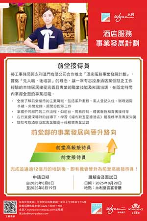 【特訊】為培育本地人才,提供職業發展機會,勞工事務局(下稱勞工局)和永利澳門有限公司(下稱永利)合作推出“永利酒店服務事業發展計劃"(下稱計劃),以“先入職、後培訓"方式,為有志投身酒店服務範疇的澳門居民,提供一系列的專業培訓及工作實踐,計劃由8月8日起接受申請。