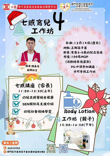 【特訊】為促進幼兒感官發展及增進親子互動,澳門工聯筷子基家庭及社區綜合服務中心將於十二月十四日舉辦 七感育兒工作坊4。活動由澳門社會工作局贊助,分設專題講座與親子工作坊兩大環節,即日起接受報名。