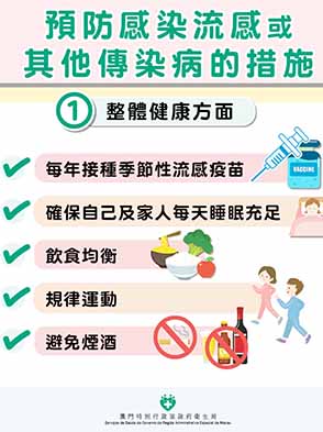 10月份共接獲3,505例流行性感冒病例申報,較去年同月的88例明顯上升,較前一個月的1,073例增加226.7%。流行性感冒(簡稱流感)是一種高度傳染性的急性呼吸道疾病,全年皆可發生,常見於冬春季(1至3月)和夏季(6至8月),而本澳最常見的流感類型為甲型流感(H1N1及H3N2)及乙型流感。流感病毒主要通過空氣、飛沫傳播,或直接接觸病者的口鼻分泌物傳播。常見症狀包括發熱、頭痛、肌肉痛、流涕、咽喉痛及咳嗽等。多數患者雖可自行痊癒,但老年人、嬰幼兒及慢性病患者可能出現支氣管炎、肺炎等併發症。接種季節性流感疫苗是最有效的預防方法。