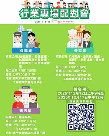 【特訊】為協助有求職需求的澳門居民盡快就業,同時緩解業界人力資源需求和壓力,勞工事務局(下稱“勞工局”)與澳門工會聯合總會(下稱“工聯”)將於12月第三周合作舉辦三場行業專場配對會,合共提供496個職位空缺。報名日期為明(12)日上午9時起至12月17日中午12時,歡迎有求職需求的澳門居民報名參加。