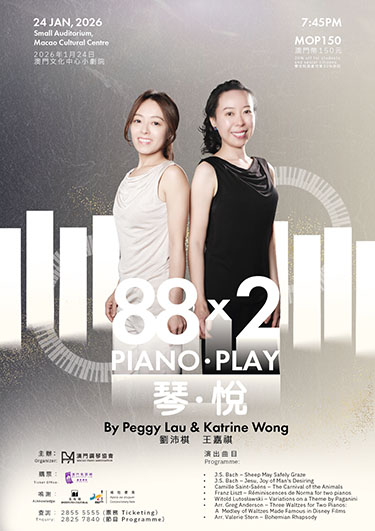 【特訊】由澳門鋼琴協會主辦,文化中心場地贊助,鋼琴博士劉沛棋與英國文學博士王嘉祺將於一月二十四日晚上七時四十五分,假澳門文化中心小劇院舉行 “88x2:琴 · 悅” 雙鋼琴音樂會。