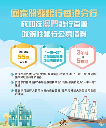 國家開發銀行香港分行首次在澳門發行政策性銀行公募債券,並首次發行“一帶一路”及葡語國家和地區的專項債券,是支持澳門更好發揮“中葡金融服務平台”作用,參與和助力“一帶一路”建設的重要體現。同時,本次債券發行亦豐富了澳門離岸人民幣市場的債券品種,體現了粵港澳大灣區協同發展的優勢,為澳門債券市場的發展注入新動力,助推人民幣國際化,並助力澳門更好地融入和服務國家發展大局。