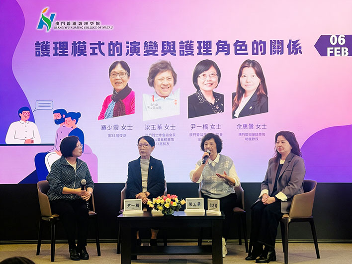 【特訊】澳門鏡湖護理學院於2月6日舉辦「護理模式的演變與護理角色的關係」真情對話活動,邀請護理及教育專家羅少霞、梁玉華及該院院長尹一橋,與學生進行分享。活動由學院助理教授余惠鶯主持,旨在讓新生深入了解澳門護理專業的發展歷程與現況,啟發學生在學習過程中建立正確的專業價值觀與人文關懷精神。