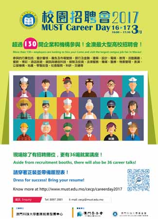 「澳科大校園招聘會二○一七」歡迎市民、各高校應屆畢業生及校友前來參與,如有任何疑問,可致電8897-2881或電郵must.cecp@must.edu.mo與黄小姐聯絡。詳情可瀏覽澳科大創業就業發展中心網站:http://www.must.edu.mo/cecp/careerday2017。