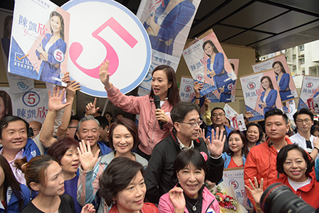 下午近5時,陳凱欣與競選團隊在美孚舉行集氣會。立法會前主席曾鈺成、行政會議成員及立法會議員林健鋒、全國人大常委會委員譚耀宗及包括民建聯、經民聯、工聯會等政團在內的多名立法會議員前來支持。