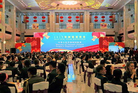 【中新社北京1月25日電】(記者 李純)中國國防部25日晚在八一大樓舉行2019年新春招待會,來自80多個國家的駐華武官及夫人240餘人應邀出席。