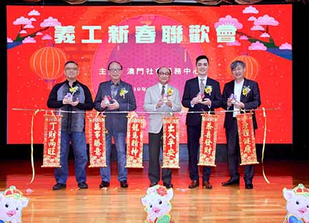 「義工新春聯歡會」邀請了澳門社會服務中心理事長崔寶峰,澳娛澳博退休員工協會大會主席張榮釗,澳門博彩股份有限公司義工隊活動項目統籌龔仕鵬,澳門社會服務中心名譽顧問梁思偉,監事長蕭宇康擔任主禮嘉賓。崔寶峰致辭表示,澳門社會服務中心成立以來,為不同階層人士提供社區服務及豐富多彩的公益及文康活動,一直都得到義工們的積極參與及協助,使每次活動都能夠順利舉辦並得到社會的認同。而義工們每日辛苦工作,都能夠抽出工餘時間去參與社會公益活動,這種精神是值得學習的,希望義工們可以將這種精神在朋輩間互相發遞,對社會作更多的貢獻。中心希望透過今次的聯歡活動,能加強大家的團隊精神,並希望義工們繼續支持澳門社會服務中心的各項工作,繼續積極參與,為促進社會的和諧發展及為市民提供更好的服務而一齊努力。