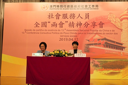 社工局在中聯辦社會工作部大力支持和協助下舉辦是次分享會,邀請澳區全國人大代表何雪卿、澳區全國政協委員賀定一擔任主講嘉賓。何雪卿在專題發言中首先介紹全國人大常委會的主要精神,分析國家當前的形勢,特別在中美貿易磨擦以及經濟下行的困難中,國家堅持“以人民為中心”為主線,今年工作重點除解決就業問題和脫貧任務外,還完善各項醫療和社會福利政策,全面改善人民的生活。何雪卿作為澳區全國人大代表積極建言獻策,促進澳門各界主動融入粵港澳大灣區建設,推動經濟適度多元發展以及 “一國兩制” 行穩致遠。