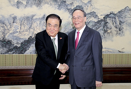 王岐山表示,中韓關係歷史基礎深厚、人民相親。在兩國元首引領下,當前雙方關係發展良好。堅持以人民為中心的發展理念,讓人民過上更加富裕文明的生活,是中國黨和政府堅定不移的追求,也是中國堅持和平發展外交主張的出發點和落腳點。中韓文化底蘊相近,共同的包容性文化特色讓我們都堅信國際事務可以通過協商合作實現互利共贏、互利多贏。“亂雲飛渡仍從容”,面對紛繁複雜的國際形勢,中韓應繼續加深雙邊合作,在多邊領域緊密溝通協調,使兩國關係不斷取得新進步。