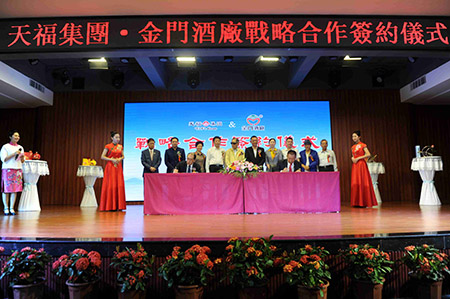 楊鎮浯一行並在福建省台港澳辦與漳州市領導陪同下,赴漳州市漳浦縣共同見證金酒公司與天福集團戰略合作簽約儀式,雙方共同開發6項酒品,首筆訂單預計於中秋前夕在天福集團轄下1200家門市上架銷售。