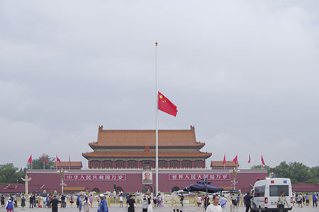 29日上午,八寶山革命公墓禮堂莊嚴肅穆,哀樂低回。正廳上方懸掛著黑底白字的橫幅“沉痛悼念李鵬同志”,橫幅下方是李鵬同志的遺像。李鵬同志的遺體安臥在鮮花翠柏叢中,身上覆蓋著鮮紅的中國共產黨黨旗。