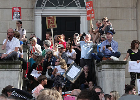情緒激憤的抗議人群阻礙了倫敦市中心的交通,導致唐寧街、威斯敏斯特大橋、特拉法加廣場以及議會廣場等主要街道和公眾場所停止車輛通行。