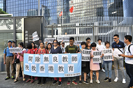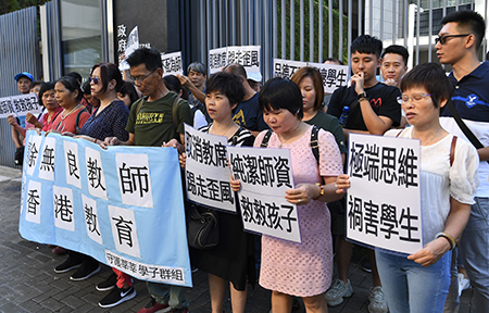 群組代表手持“開除無良教師,挽救香港教育”的橫幅,手持“極端思維,禍害學生”“取消教席,踢走歪風”“品德敗壞,不配為師”的標語,並高呼口號,強烈要求教育局,開除無良教師。