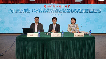 講座上,張桂達廳長先從政府在食品安全監察工作以及澳門豬肉供應情況作介紹。他指出,政府嚴謹執行《食品安全法》,設入口監測及市場監督制度雙重防線,監管食品安全系統工作。對供澳鮮活、冰鮮及急凍肉類均嚴格把關。另外,雖然現時內地受非洲豬瘟影響,特區為確保供澳活豬安全,積極協調供澳養殖場活豬調配,開拓各類貨源以及打擊走私食材活動,防止未經檢疫的豬肉運入澳門,保障市民食得安心。