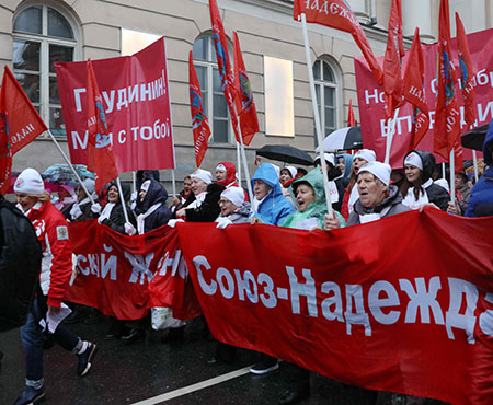 當天下午,莫斯科下著小雨,約有上千名民眾參加了俄羅斯聯邦共產黨、“蘇維埃軍官聯盟”、全俄婦女運動等左翼政黨和團體組織的遊行活動。遊行隊伍從斯特拉斯大街出發,沿著彼得羅夫卡大街行進,到達了紅場附近的馬克思雕像。期間,遊行者手舉“偉大的十月”等標語,揮舞著旗幟,不時高呼“列寧萬歲”等口號。