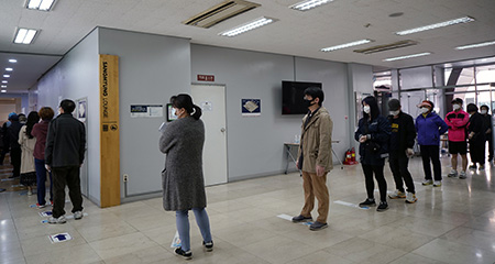 當天記者在首爾鍾路區一個投票站看到,所有人員需接受體溫檢查、佩戴口罩才可入場。現場貼有通知稱,人員間距必須超過1米,民眾排起一列列“稀鬆”的長隊。