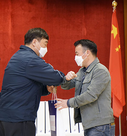 當天,中國駐韓國大使邢海明與領取“健康包”的中方人員以“碰拳”代替握手。邢海明表示,發放“健康包”既是為中方人員安全工作增添一份保障,也是提前致以“五一”國際勞動節問候。