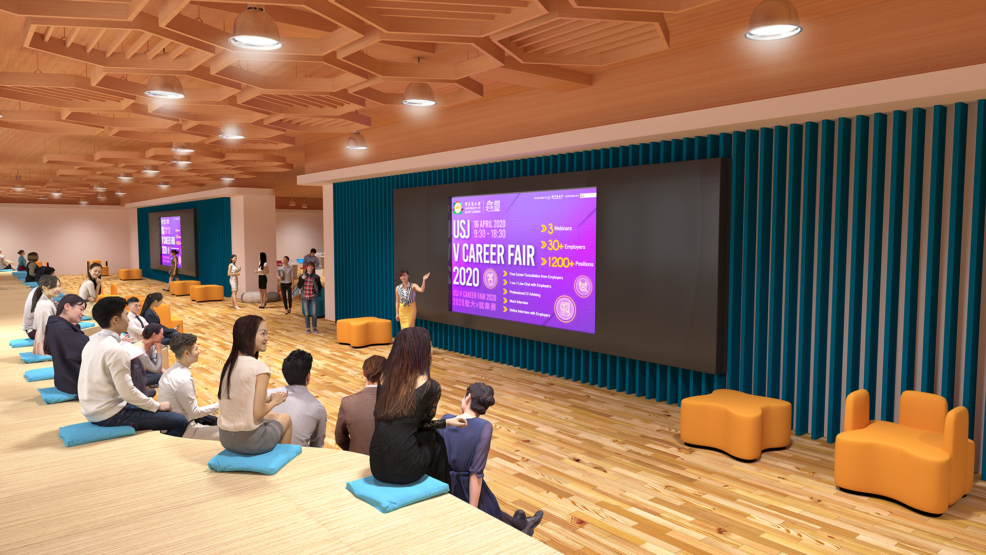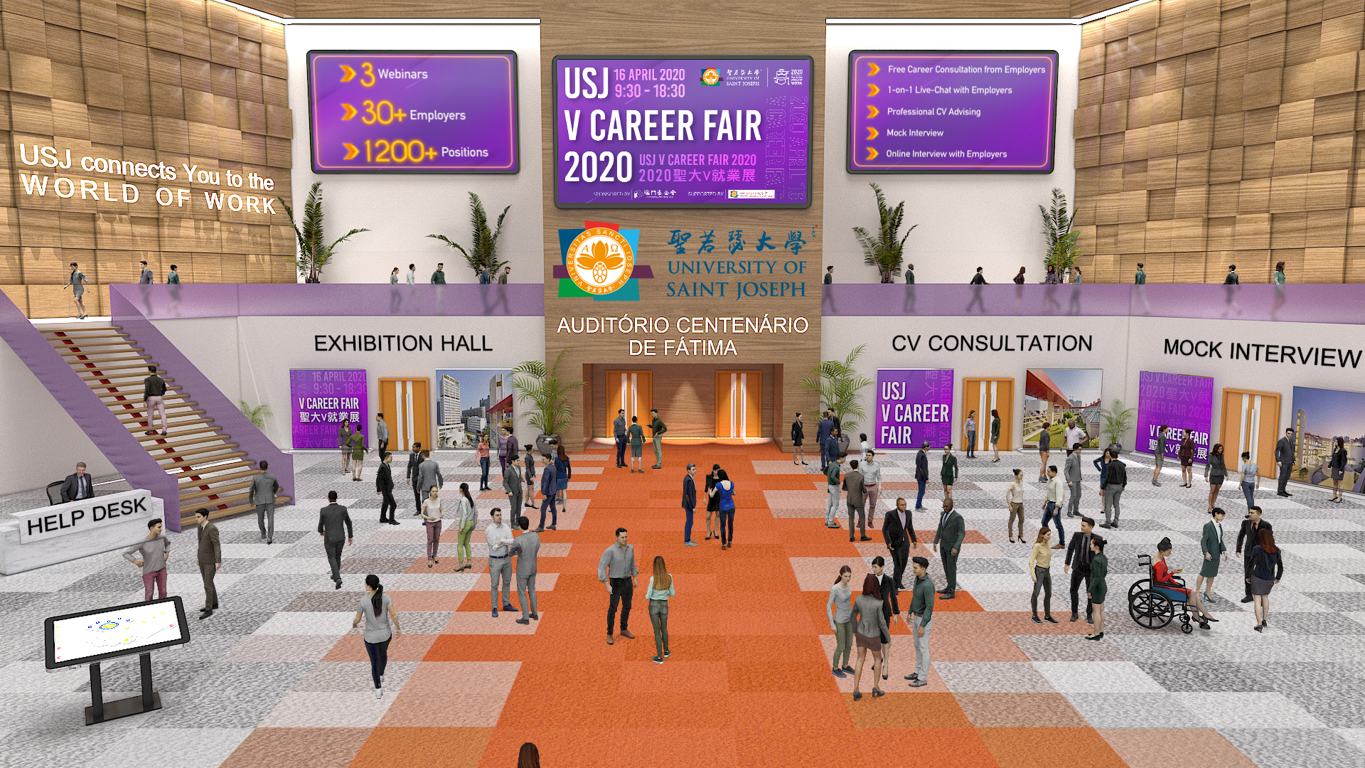 2020聖大V就業展於週四(四月十六日)舉行,是次就業展共有三十間公司參加,提供超過一千二百個不同種類的職位。當日線上展覽攤位共錄得超過二千人次造訪。平台將繼續開放至五月十六日,繼續提供職位資訊及線上應徵等服務,以及上載就業主題講座讓學生及校友隨時重溫 。