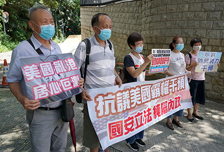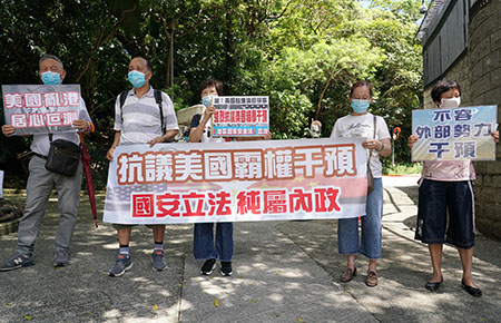 當日上午,一群愛國愛港的香港市民在美國駐港總領事館外舉行集會,並拉起“抗議美國霸權干預,國安立法純屬內政”的橫幅,手持“美國亂港,居心叵測”“不容外部勢力干預”的牌子。