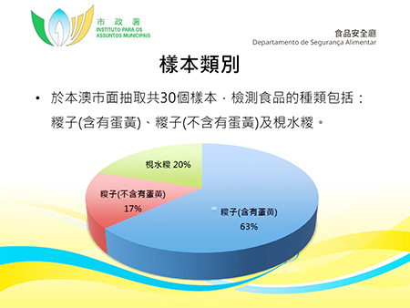 本次抽查的食品樣本包括傳統肉糉、素糉及梘水糉等共三十件,分別進行了微生物檢測包括沙門氏菌、金黃色葡萄球菌、蠟樣芽胞桿菌,以及化學檢測包括硼砂或硼酸、蘇丹紅(僅限含蛋黃的樣本)。根據化驗結果顯示,所有樣本的微生物及化學檢測結果均未見異常。