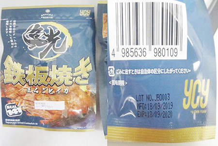 市政署恆常對本澳各零售點的食品抽檢工作中,發現一款名稱為「魚光鐵板燒魷魚乾YCY Snacks Premium」的預包裝零食有明顯發霉的情況。涉事產品的產地為泰國,淨重四十克,批次為LOT NO. JBD003;生產日期為18/09/2019;保質期為18/09/2020。市政署食品安全廳已即時採取跟進措施,勒令涉事商戶停售有關問題批次產品,並追溯產品的來源及銷售流向;同時,向本地食品供應及零售商發出食品預警;由於涉事產品經香港供應商所提供,市政署亦已通報香港食安部門知悉及跟進事件。