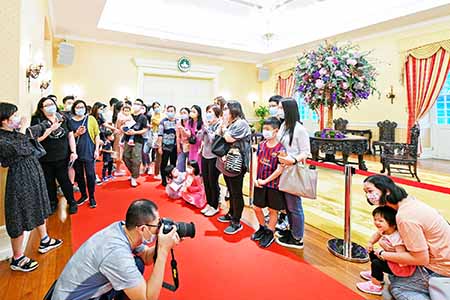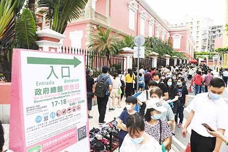 政府總部昨日(十八日)第二日開放參觀,不少市民一早到場,參觀者必須出示健康碼和測體温,以及通過安檢。市民和旅客可從政府總部禮賓樓右側的擺華巷入口進場,沿途參觀位於地下的多功能廳及蓮花廳,經雲石樓梯步上一樓大廳,繼續參觀以主色調命名的「綠廳」、「黃廳」、「藍廳」,亦可從現場展示的圖片了解各個廳的功能和作用。之後前往花園,細緻欣賞這幢具有南歐風格的建築物。期間,多功能廳設有「澳門韶華」圖片展,導賞員還為公眾介紹禮賓樓一樓的室內陳列,藉此加深遊人對澳門城市的變遷和政府總部的認識。