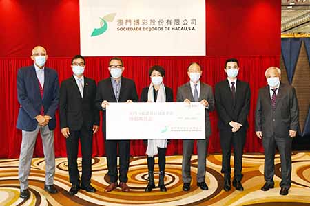 支票遞交儀式昨天於新葡京酒店茶花廳舉行,澳博常務董事梁安琪女士、董事何猷亨先生及秘書長官樂怡大律師將善款支票遞交澳門日報讀者公益基金會,由副會長飛安達、理事長黃國勝、常務副理事長何榮祥、理事李永順代表接受。