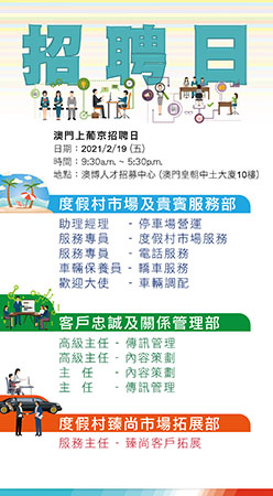 【特訊】勞工事務局十分關注本澳居民的就業情況,並持續與大型企業保持聯繫及合作,為居民創造更多就業機會。今年有多間綜合型酒店渡假村相繼落成,可為本澳居民提供較多就業崗位。為助居民拓寬就業機會,勞工局將於2月19日與上葡京合作舉辦招聘會,屆時會派員監察面試情況,招聘職位包括市場推廣及客戶服務等多個範疇的職種。是次招聘會以預約方式進行,對上述職位有興趣的居民,可直接聯絡企業或致電勞工局熱線2872 2108查詢。