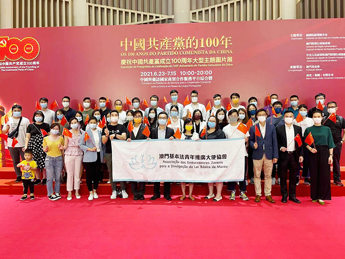 【特訊】日前,澳門基本法青年推廣大使協會(下稱「基青會」)在會長高嘉仁、理事長黃嘉淇帶領下,組織會員參觀「中國共產黨的100年——慶祝中國共產黨成立100周年大型主題圖片展」,邀請到澳門基本法推廣協會副理事長兼秘書長、基青會名譽顧問何少金一同出席,參加活動的還有基青會副會長吳毅豪、副理事長兼秘書長崔天立、副理事長張燕青、鄧俊賢、蘇柏靜、副監事長李詠豪,以及基青會一眾理監事近五十人,目的是讓會員深入瞭解中國共產黨的百年奮鬥歷程,築牢愛國愛澳社會政治基礎,進一步增強對中國共產黨和國家的認同感。