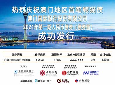 【特訊】2021年7月23日,為積極響應粵港澳大灣區建設政策號召,在澳門中聯辦、中國人民銀行等各級政府及監管單位高度重視下,在廈門國際銀行集團指導支持下,澳門國際銀行在中國境內銀行間市場成功發行第一期15億元熊貓債。本期債券是澳門地區主體在中國境內銀行間債券發行市場的首次亮相。主承銷商為中國銀行、中信證券與浦發銀行,發行評級為境內最高AAA評級,發行利率為3.28%,認購倍數達到3.53倍,本期債券所募資金將用於支持澳門國際銀行在中國境內尤其是粵港澳大灣區的業務發展。
